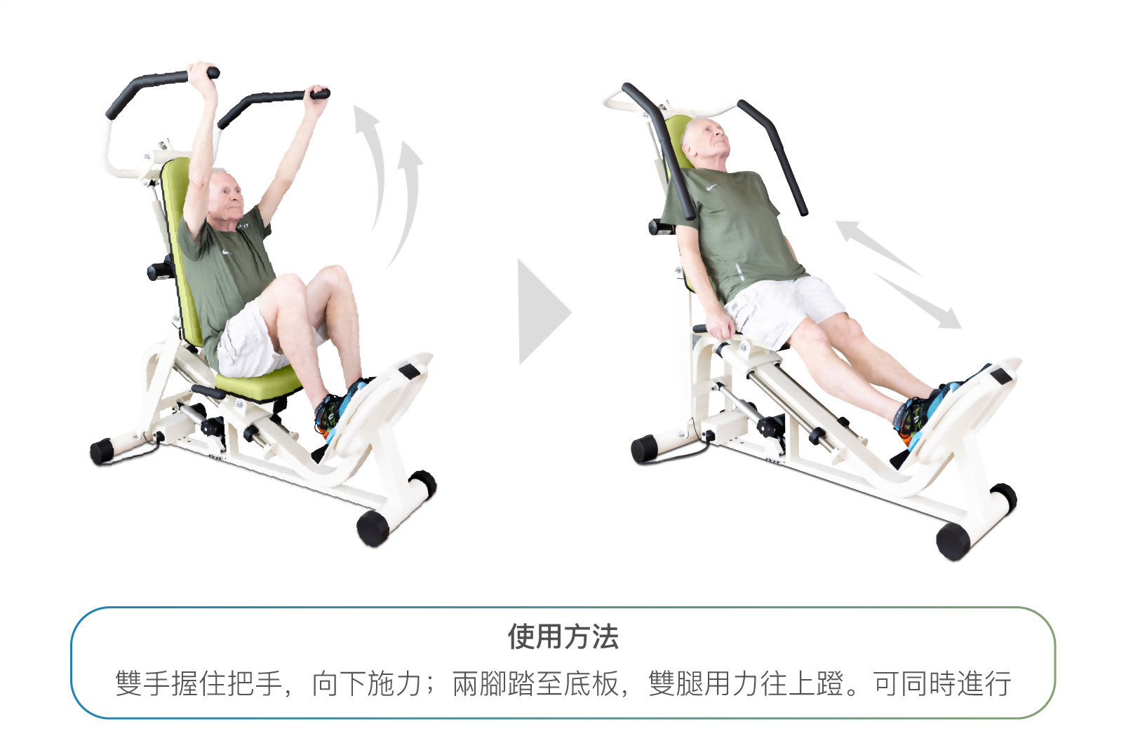 - 多功能設計,可同時訓練上下肢肌力。
