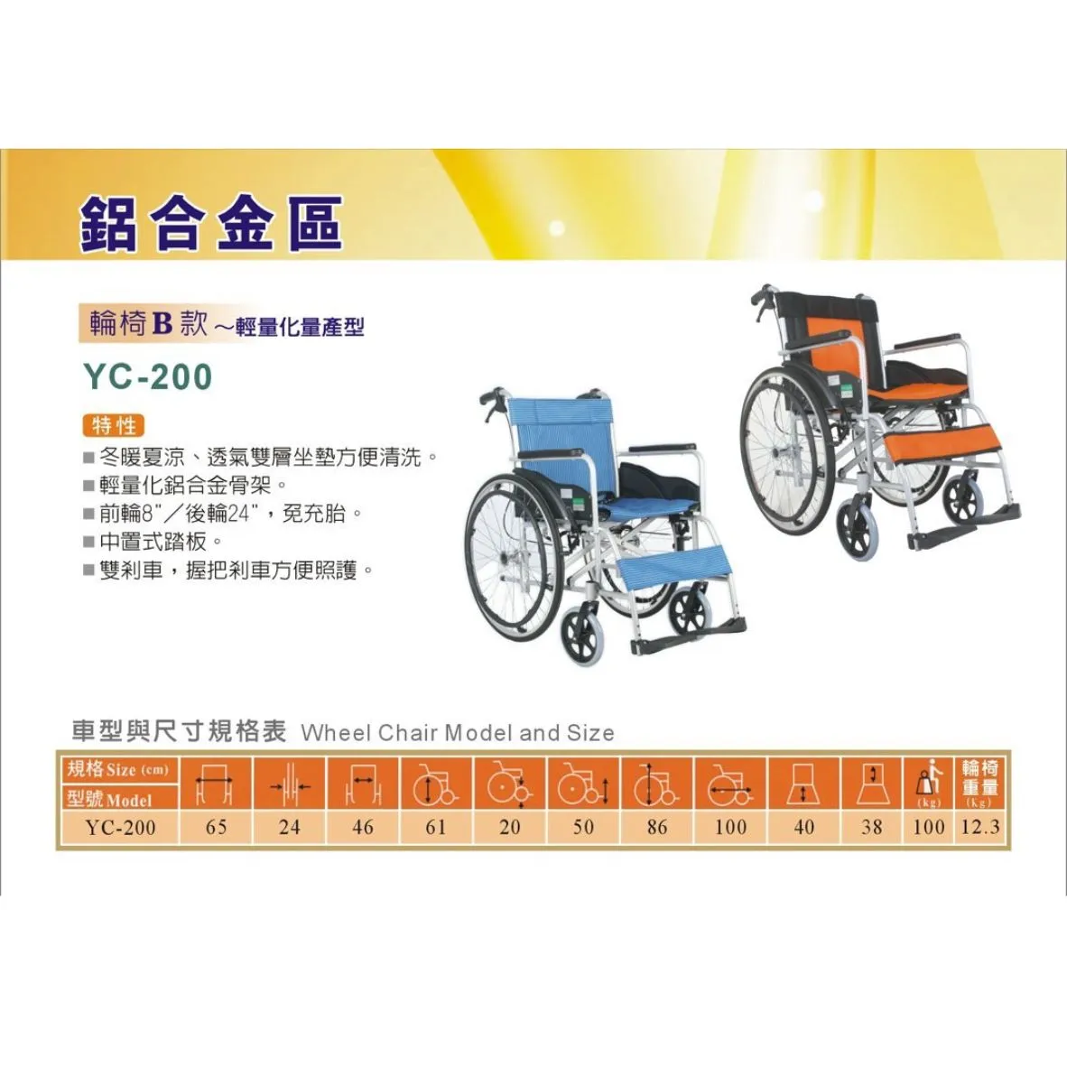 首頁 > 嚴選商品 > 健康之星-輔具用品 > 輪椅B款 > "頤辰" YC-200 鋁合金輪椅B款 輕量型