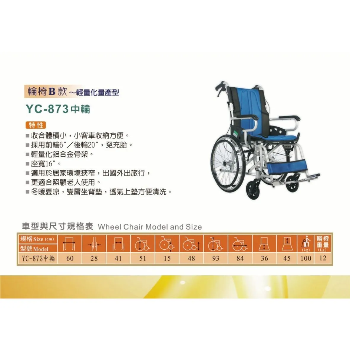 首頁 > 嚴選商品 > 健康之星-輔具用品 > 輪椅B款 > "頤辰" YC-873 鋁合金輪椅B款 中輪